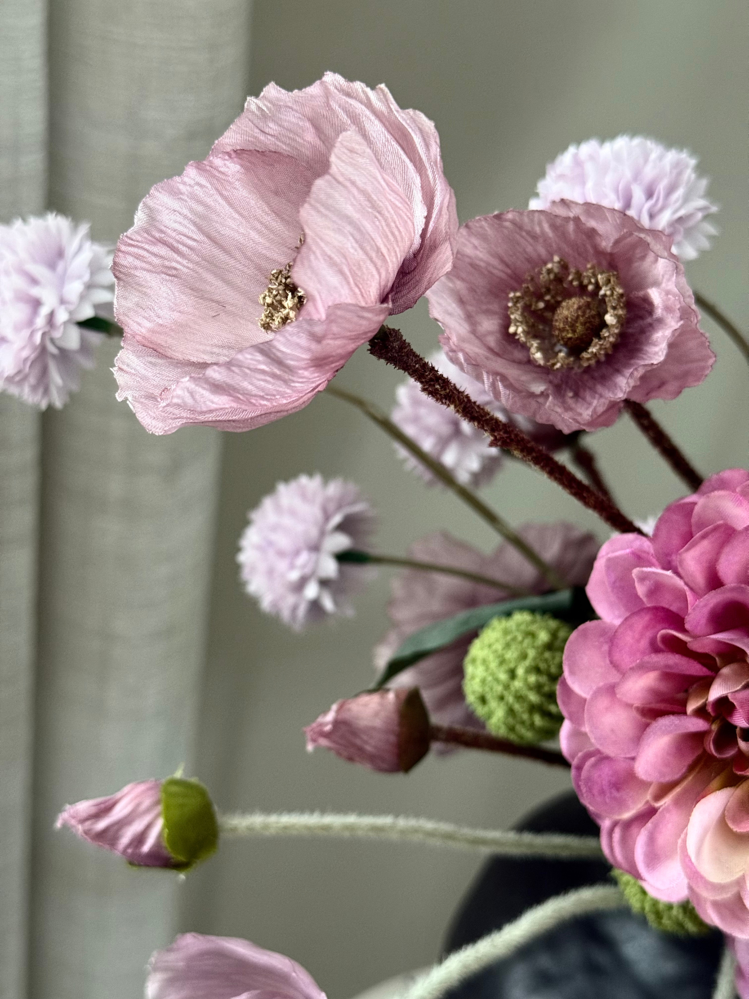 Playful pink dahlias, lilac poppies and dandelions contrast in this asymmetric arrangement with green orchid flowers.