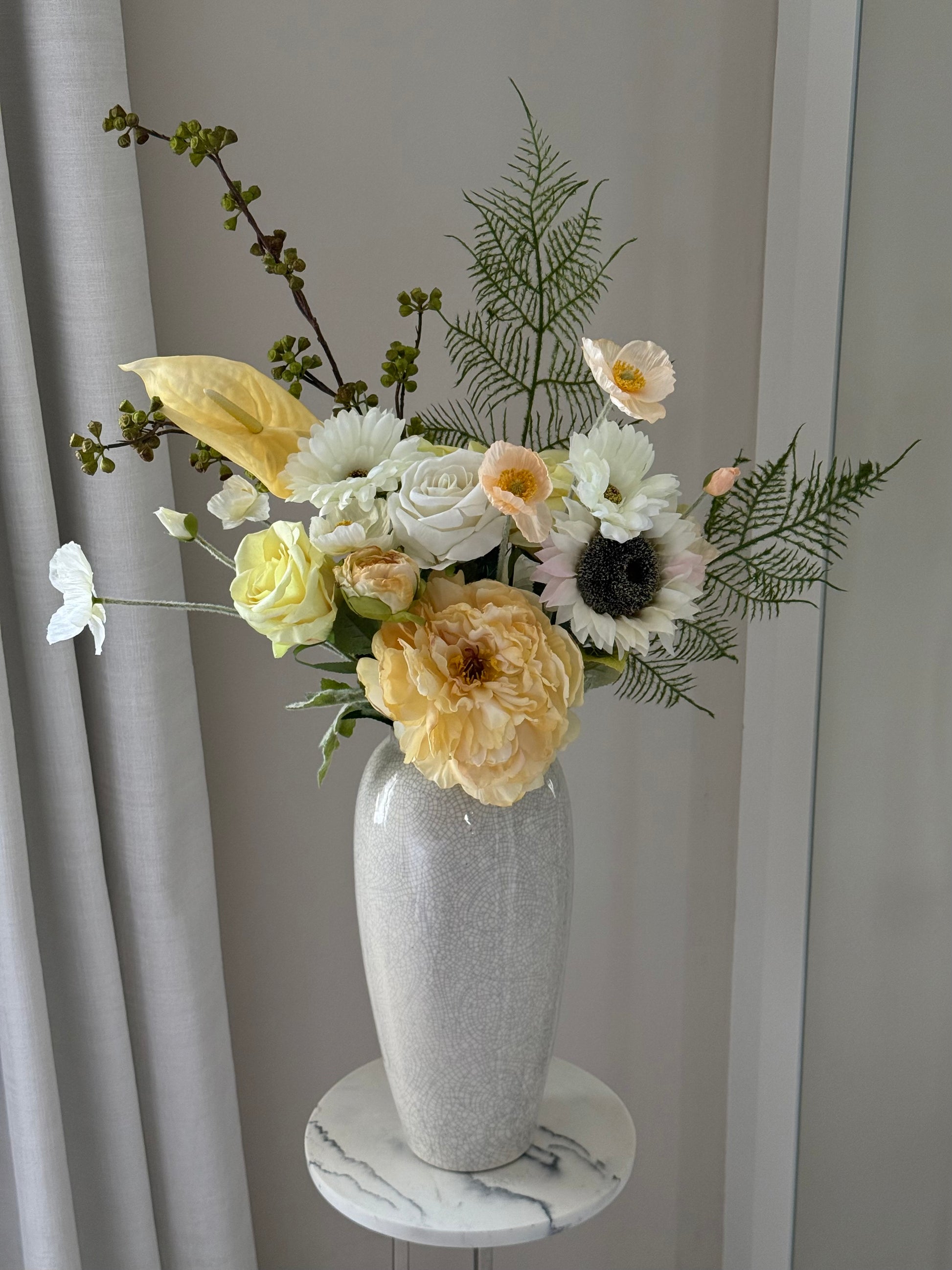 The Dora bouquet is a buttery composition that balances warmth and calm. Yellow roses, peonies, and anthuriums bring a gentle radiance, softened by white poppies, chrysanthemums, and creamy peonies. Green fern and seeded branches add an airy structure, evoking sunlight filtering through soft foliage. The result is an arrangement that feels both refreshing and timeless... a tranquil glow that brightens any space with graceful ease.