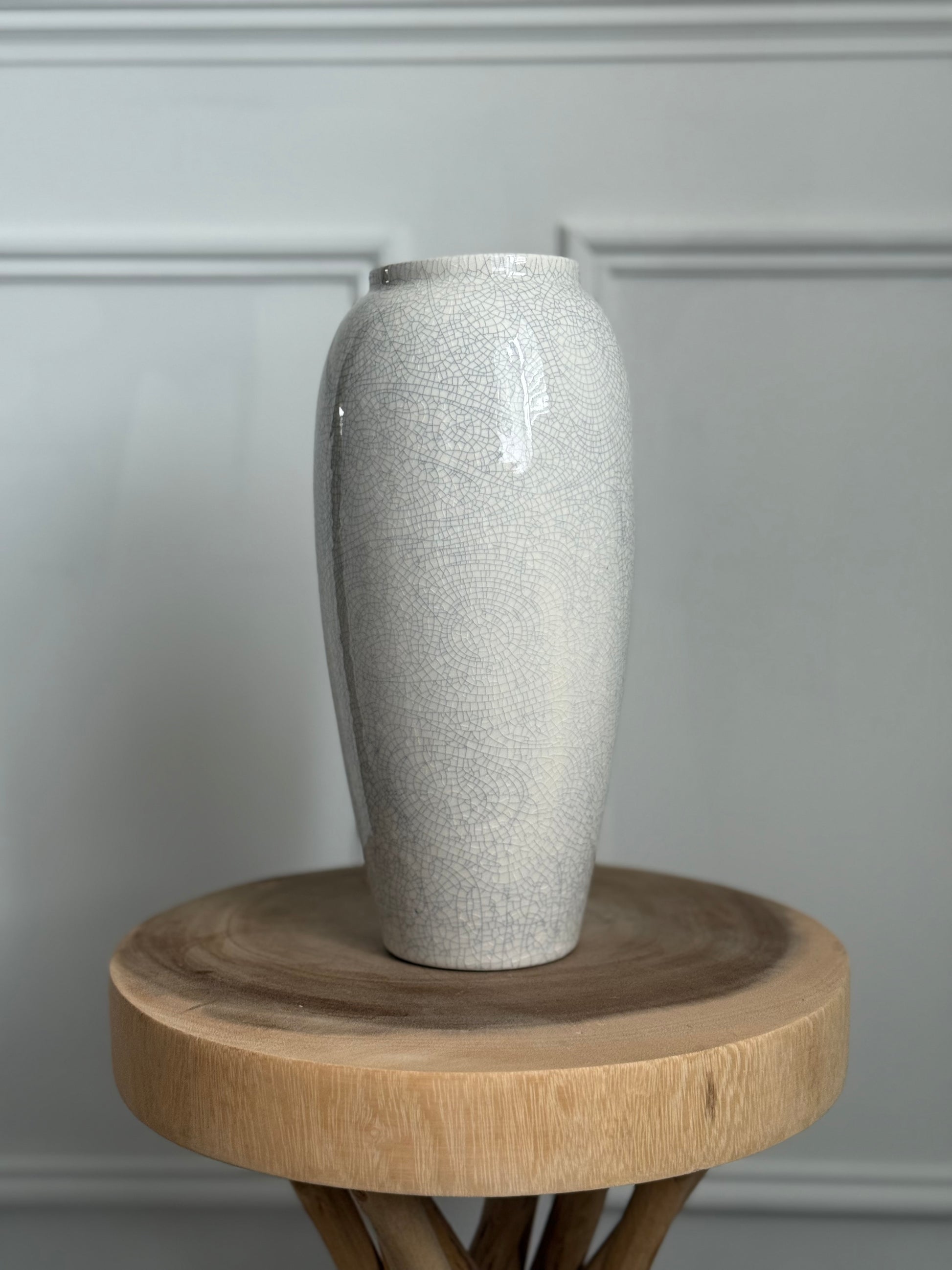 This striking cream gloss vase features a rustic cracked texture that gives it personality and subtle texture. Its sleek finish makes it feel polished and refined - a perfect accompaniment to florals.