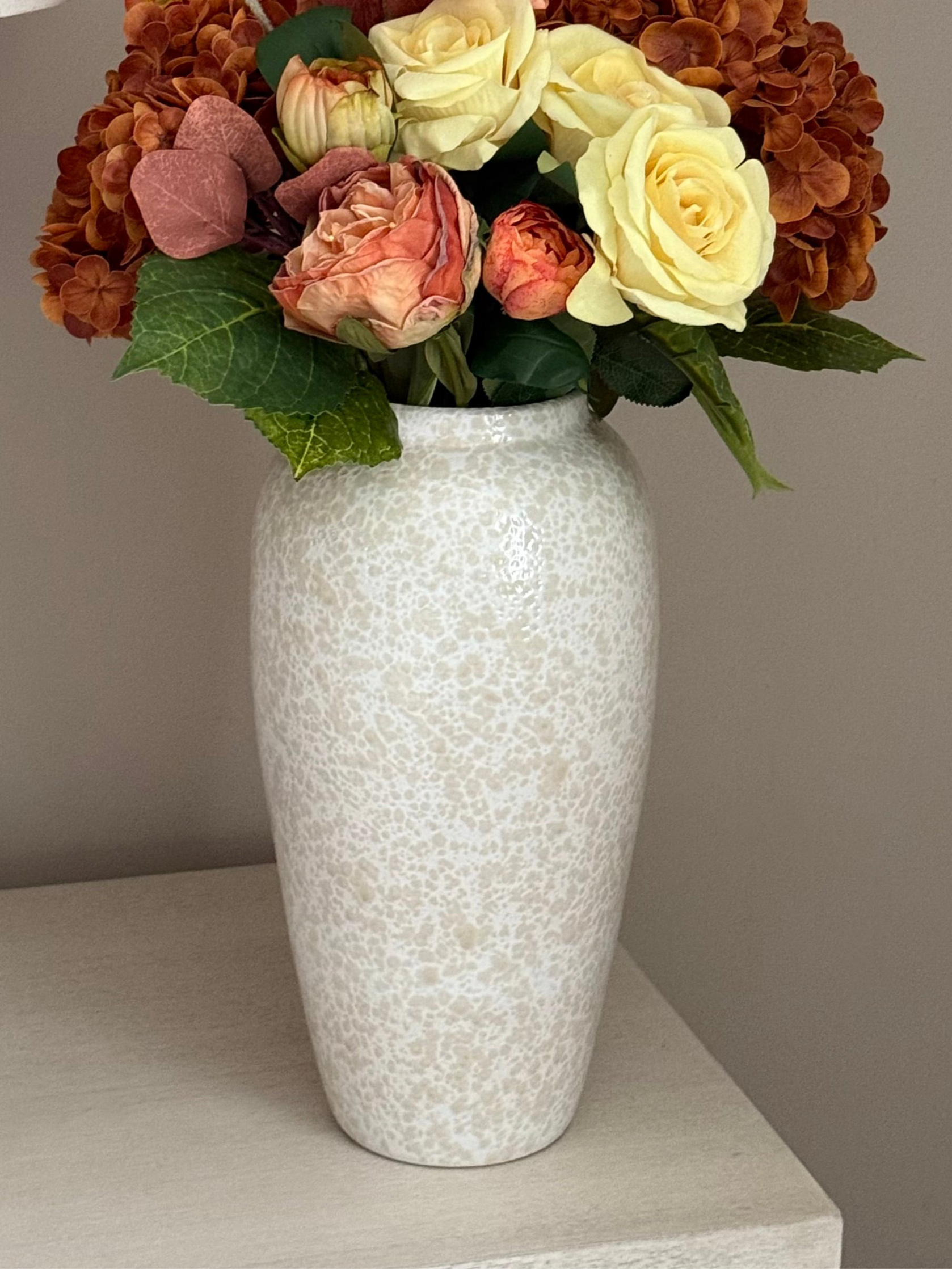 This rustic white vase features a soft, matte finish with subtle beige-toned texture, giving it a naturally aged, earthy character. Its neutral palette makes it the perfect match for our standalone bouquets, adding warmth without distraction.
