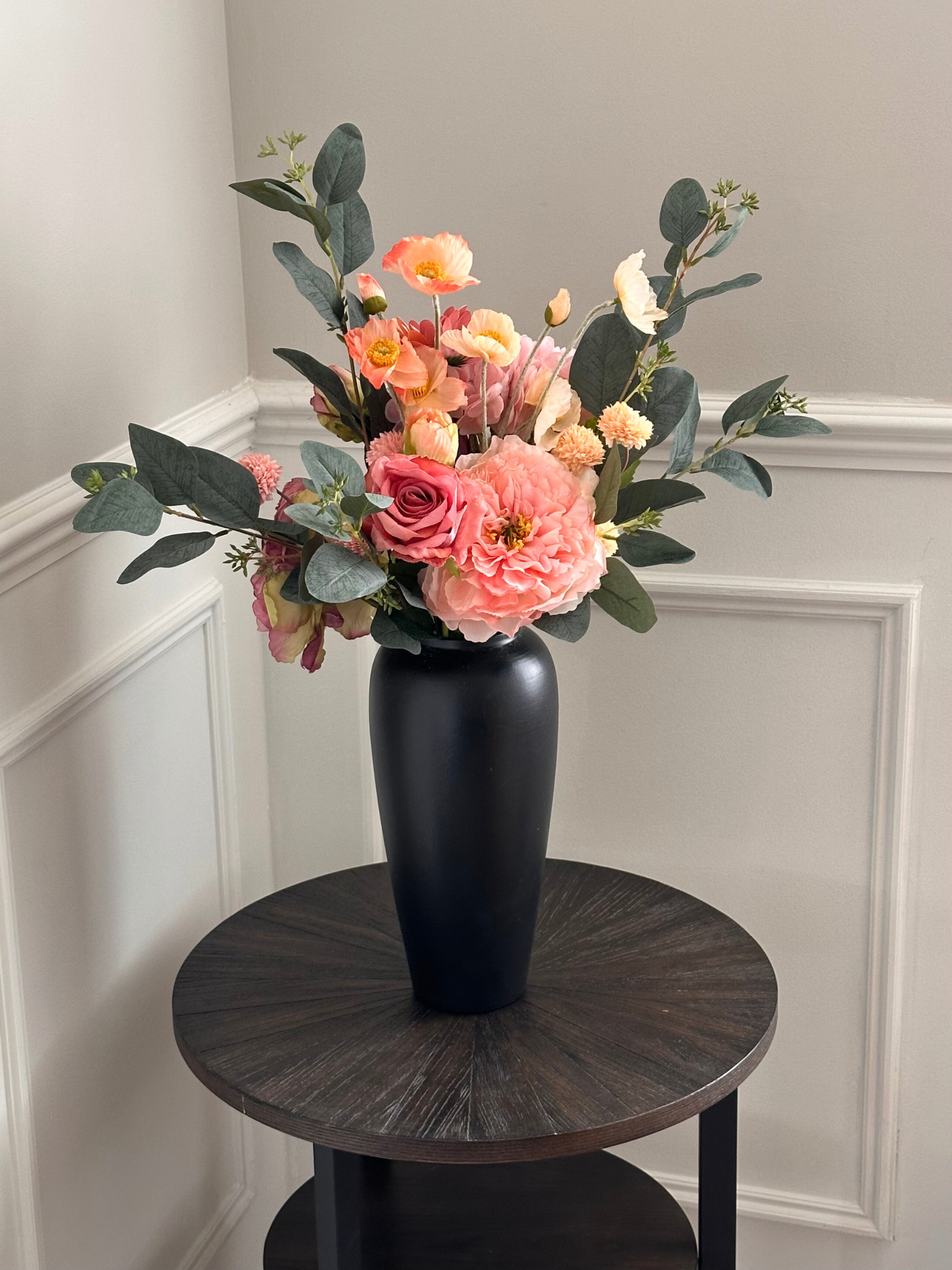The Lauren bouquet is full of warmth and elegance, blending coral, pink, and plum tones. Blush peonies, dusky tulips, and lilac chrysanthemums are paired with soft greens and peachy dandelions for a bouquet that’s both refined and effortlessly pretty.