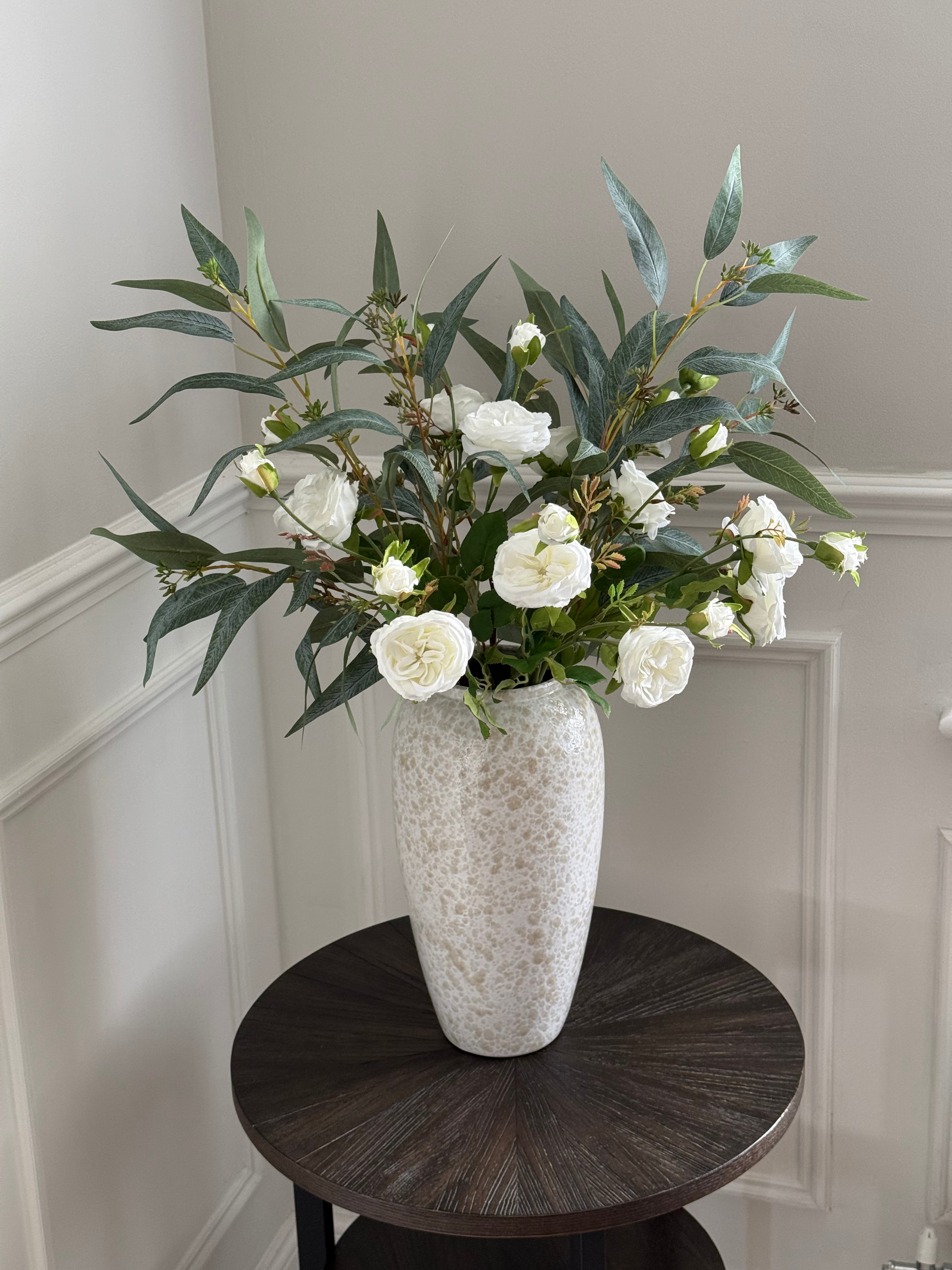 Classic and quietly radiant, Louisa is a large bouquet which pairs the timeless beauty of white David Austin roses with slender willow leaf foliage, bursting with textural seeds. The creamy, ruffled blooms bring softness, while the elegant green leaves add a sculptural, airy frame, a bouquet that feels fresh, graceful, and endlessly versatile.